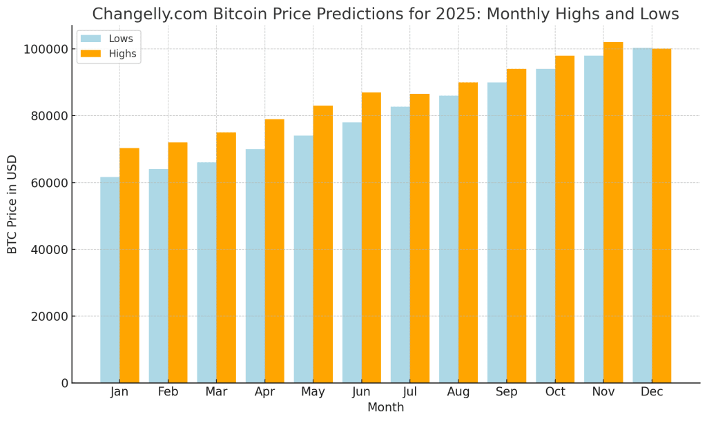 changelly.com の 2025 年の指標によると、ビットコインは毎月安定した成長を維持すると予想されています。1 月の予測では、価格は 61,651.60 ドルから 70,344.69 ドルの間になると予想されています。2025 年 7 月までに、ビットコインは 82,730.07 ドルから 86,595.37 ドルの範囲に上昇する可能性があります。2025 年 12 月に向けて、予測では最高 100,137.61 ドル、最低 100,295.47 ドルを示唆しています。予測 ROI は 61.1% で、今年は一貫して上昇の勢いが見られる可能性があります。