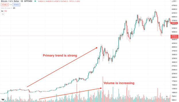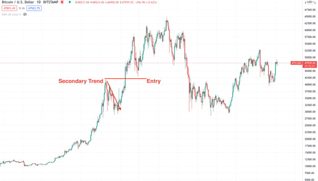 上の画像は、主なトレンドが強気である BTC/USDT 日足チャートです。強気トレンド内には、二次トレンドとしてマークされた弱気修正があります。