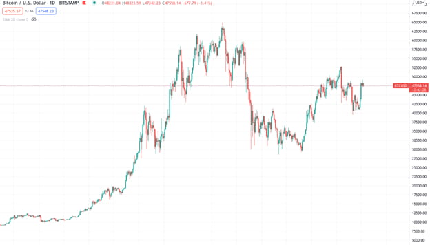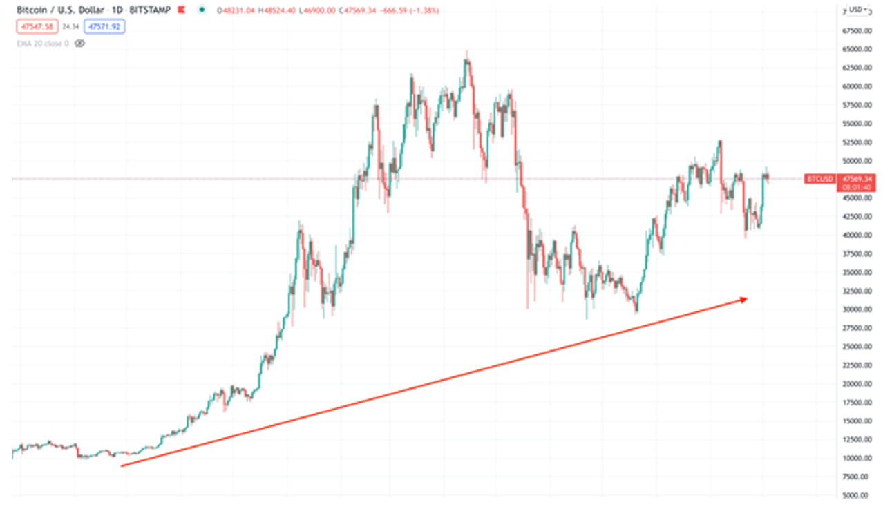 上記の BTC/USDT 日足チャートの画像は、30% ~ 50% の売りがあったとしても、価格が強い上昇トレンド内で上昇していることを示しています。