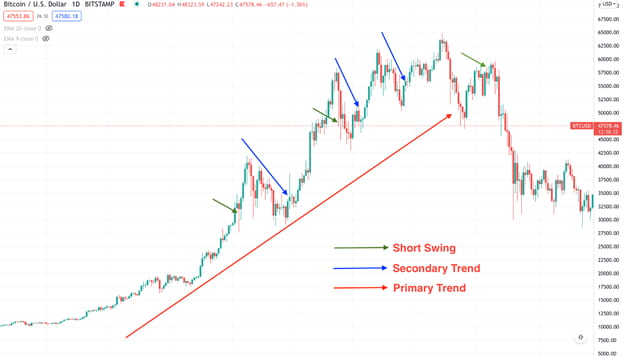 暗号通貨市場でダウ理論を適用する方法: プライマリートレンドとセカンダリートレンド