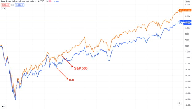 理想的には、工業株平均と運輸株平均が連動して動くことで、安定した市場センチメントが裏付けられるはずです。一方の指数が上昇し、もう一方の指数が下落すると、乖離が生じ、現在の市場トレンドの反転の前兆となる可能性があります。