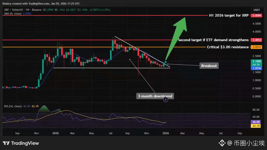 XRP强势突破3个月下跌趋势,18%涨幅突破2.20美元关键阻力,7天吸金4316万美元ETF流入。分析师预测:历史性突破2美元关口或推动价格冲击3.84美元前高,艾略特波浪理论指向2026年5美元目标。周线图显示卖方动能衰竭,3美元将是下一关键战场。