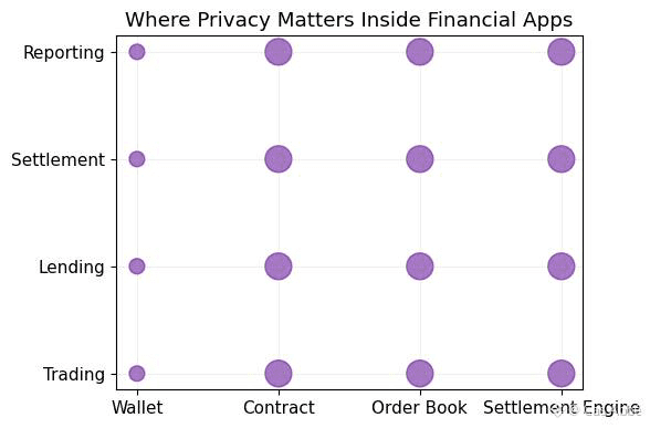 Herein lies one cause of serious finance hesitation. Institutions do not desire privacy in some place. They require seclusion in the areas where the actual logic occurs trading systems, lending systems, settlement flows, and order processing. In case such apps compromise sensitive information, then the market becomes manipulable.