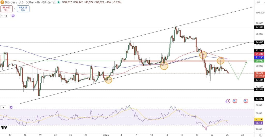 $87,300 – $88,000の領域は最終的な限界です。この領域を維持できれば回復の機会が開かれますが、崩れれば$85,600への道が開かれます。