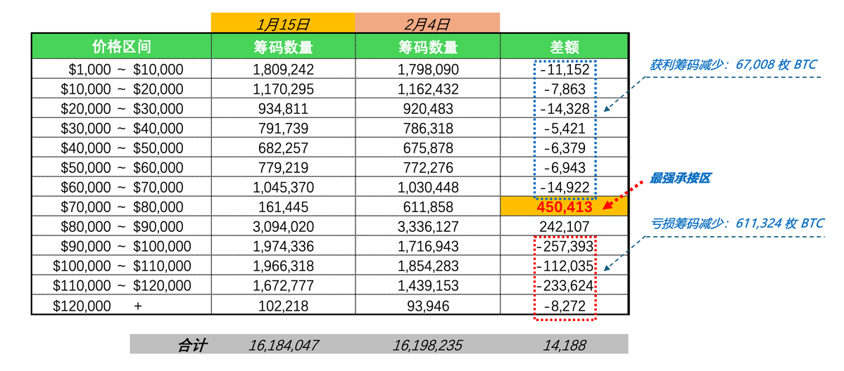 2月4日BTC已从1月15日$97,000的高点跌至$73,000;速度快,幅度深,让原本以为会在8w有所抵抗的乐观情绪被瞬间浇灭。这要说不恐慌那是假话。因此,我们有必要来复盘在此期间,BTC的筹码结构发生了什么变化,其背后又隐藏着哪些重要信息?