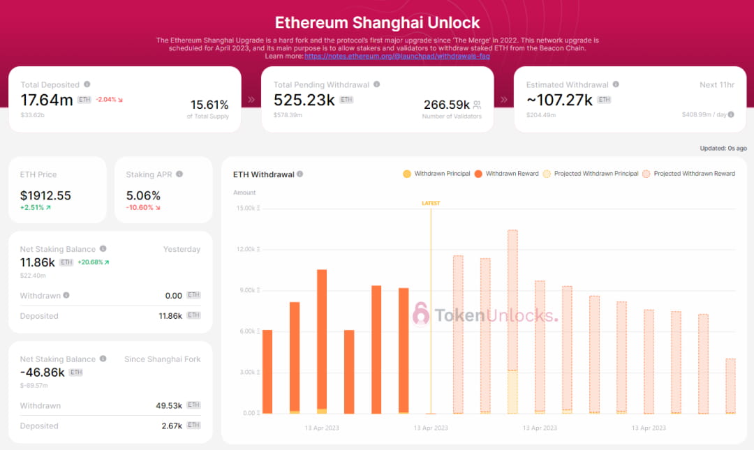 イーサリアムは北京時間4月13日6時30分にShapellaのアップグレードを正常に完了しました。トークンアンロックのリアルタイムデータによると、アップグレード完了後の公開時点で、イーサリアムの純引き出しは50,000となっています。次の 11 時間で、出金数は 107,000 イーサリアム コインになると予想されますが、まだ 525,000 イーサリアム コインが出金を待っていると予想されます。現在、イーサリアムのプレッジ総額は1,764万にまで減少し、プレッジの年率換算収益率は5.06%となっている。