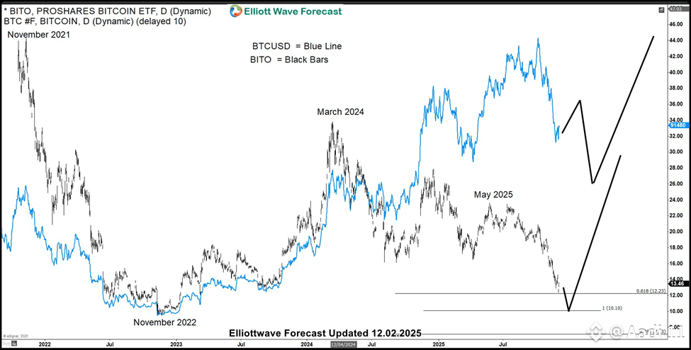 This chart highlights how closely Bitcoin ($BTCUSD) tracked BITO (ProShares Bitcoin ETF) from the November 2022 low to the March 2024 high. While the two assets appear to diverge after March 2024, a closer inspection reveals that Bitcoin continued to follow BITO’s directional path, albeit with a different magnitude of swings. This divergence in amplitude allowed Bitcoin to extend its rally all the way to the October 2025 high, even as BITO began its corrective phase. The recent decline in Bitcoin suggests that it has now completed its cycle from the November 2022 low, and is entering a broader corrective phase. Importantly, this correction is expected to persist until BITO reaches its extreme area near $10.10—a level derived from the 100% Fibonacci extension of the first leg down from the March 2024 peak, projected from the December 2024 peak.
