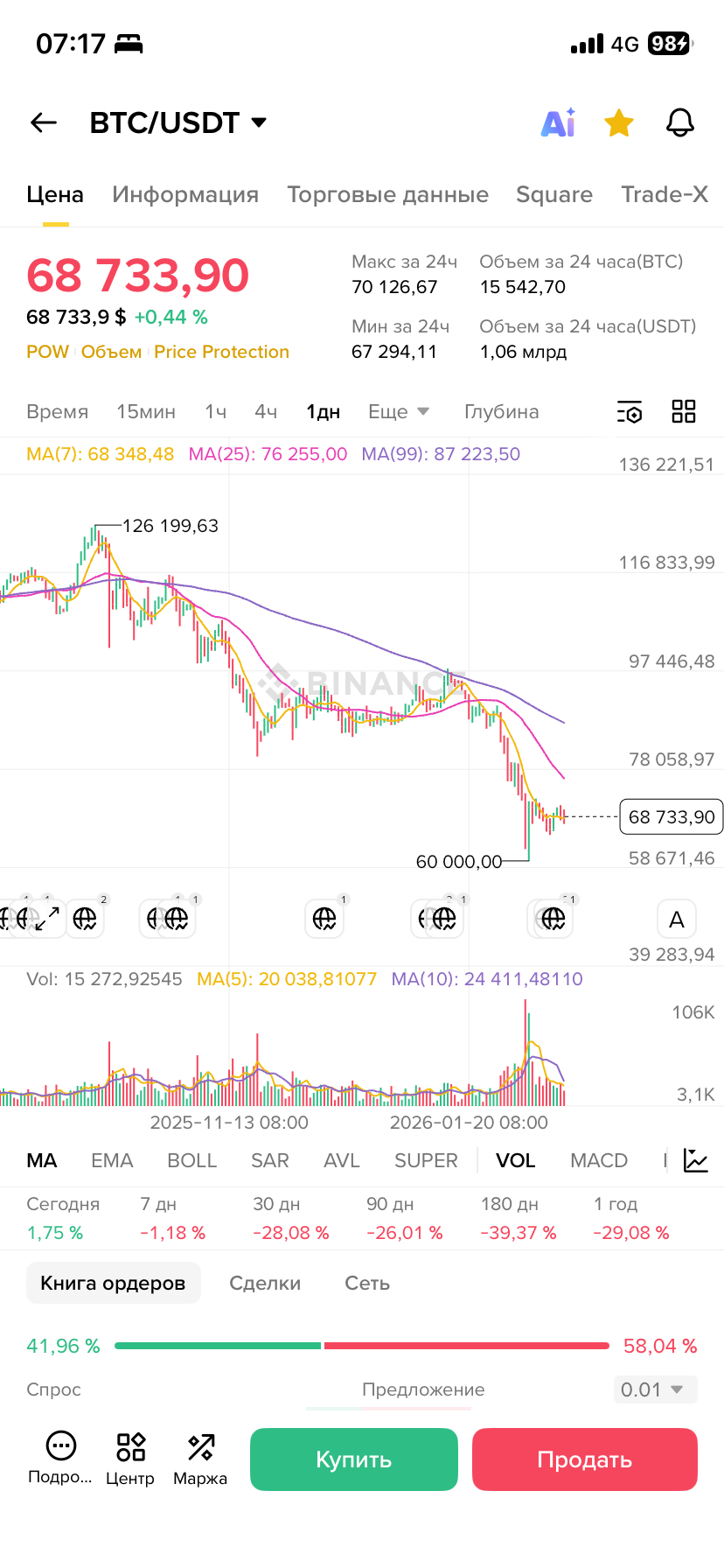 3. Tirgus noskaņojums: Pasūtījumu grāmata (apakšā) rāda pārdošanas pārsvaru (58% pret 41%), kas norāda uz saglabājošos spiedienu. Pūlis joprojām baidās.
