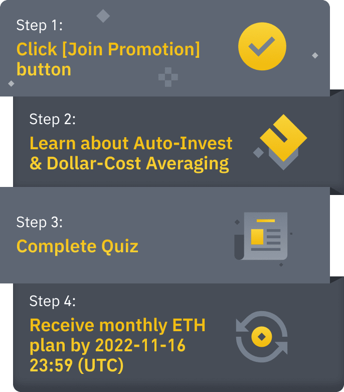 Każdy z kwalifikujących się użytkowników otrzyma miesięczny plan Auto-Inwestycji ETH o wartości 0,05 BUSD. Kwota 0,05 BUSD zostanie równo podzielona na okres pięciu miesięcy w celu zakupu ETH, za pośrednictwem miesięcznego planu Auto-Inwestycji (tj. 0,01 BUSD na ratę).
