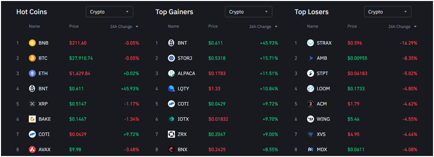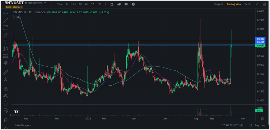 Speaking of bullishness, Bancor or BNT is the #1 top gainer on Binance, the 4th hottest, the 3rd largest by trading volume, and the #1 top futures-traded crypto.