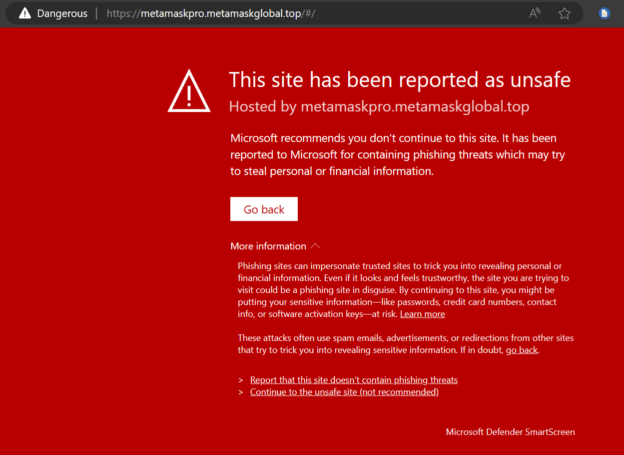 Gdy użytkownik kliknie którykolwiek z fałszywych linków umieszczonych w adresach URL witryn rządowych, zostanie przekierowany na fałszywy adres URL zamiast na oryginalny adres URL „MetaMask.io”. Po uzyskaniu dostępu wbudowane zabezpieczenia firmy Microsoft — Microsoft Defender — ostrzegają użytkowników o możliwej próbie wyłudzenia informacji.