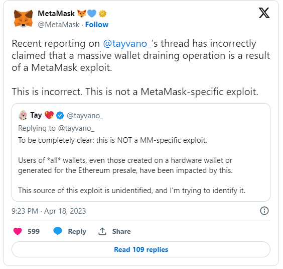 Dostawca portfela stwierdził, że 5000 ETH zostało skradzionych „z różnych adresów w 11 łańcuchach bloków”, potwierdzając, że twierdzenie, że zhakowano fundusze z MetaMask, „jest błędne”.