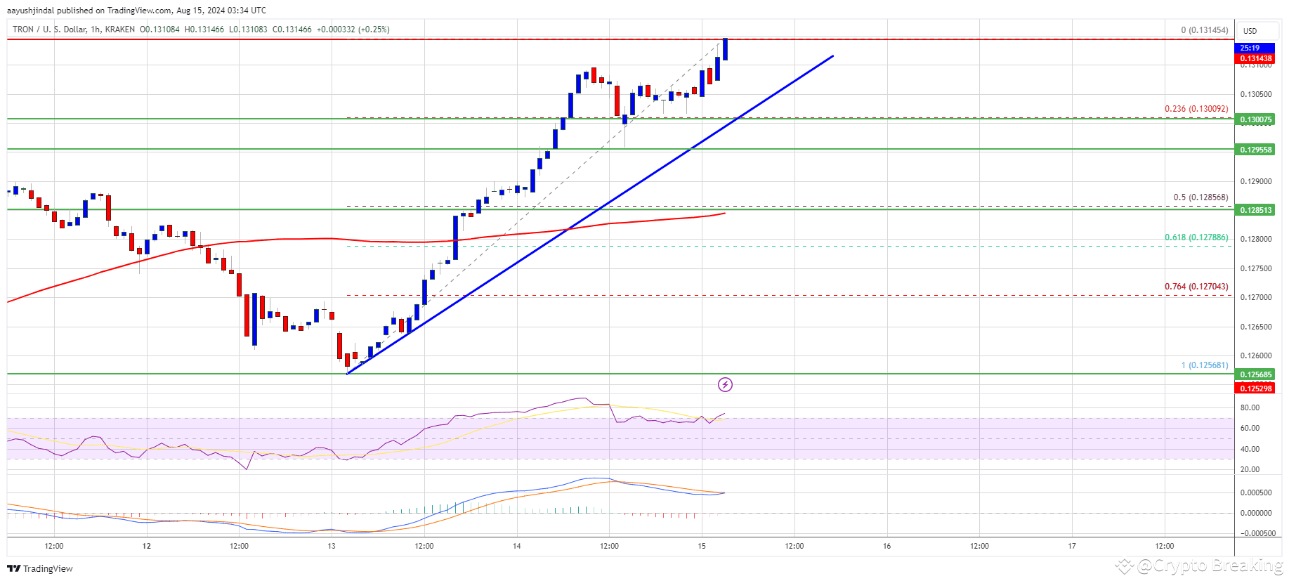 Doszło do przyzwoitego ruchu powyżej strefy oporu $0,1300. Cena TRX przetestowała nawet poziom $0,1315. Maksimum uformowało się na $0,1314, a cena wykazuje oznaki dalszych wzrostów. Na godzinowym wykresie pary TRX/USD uformowała się również kluczowa bycza linia trendu ze wsparciem na $0,1305.