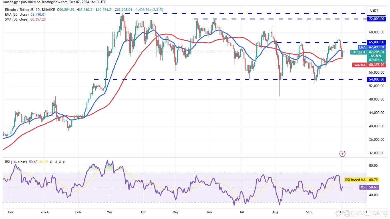 Nieutrzymanie ceny powyżej 65 000 dolarów doprowadziło do wyprzedaży Bitcoina, powodując spadek ceny poniżej 20-dniowej wykładniczej średniej kroczącej (62 490 dolarów) 1 października.