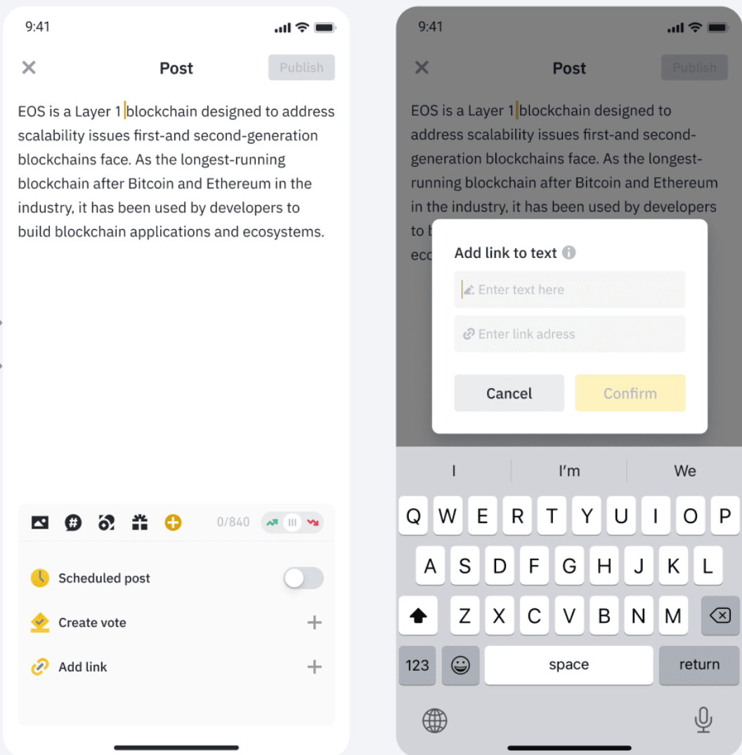 Twórcy mogą wzbogacać treści, dodając hiperłącza do innych artykułów Binance lub swoich historycznych artykułów w serwisie Square.