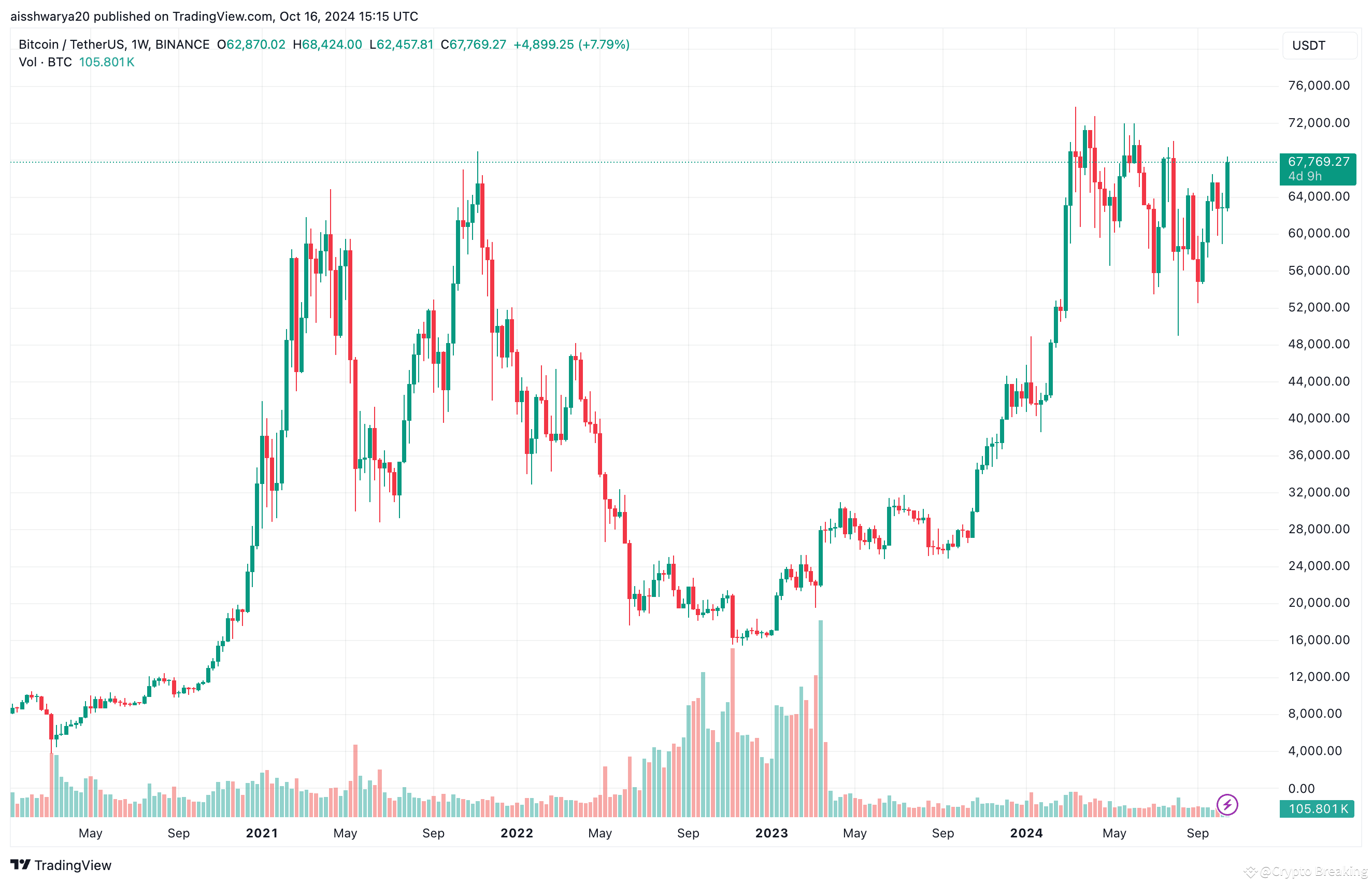 Po niewielkim wycofaniu po ataku Iranu na Izrael na początku tego miesiąca, cena bitcoina wzrosła w ciągu ostatniego tygodnia o prawie 10%, osiągając w chwili pisania tego tekstu cenę 67 769 dolarów.