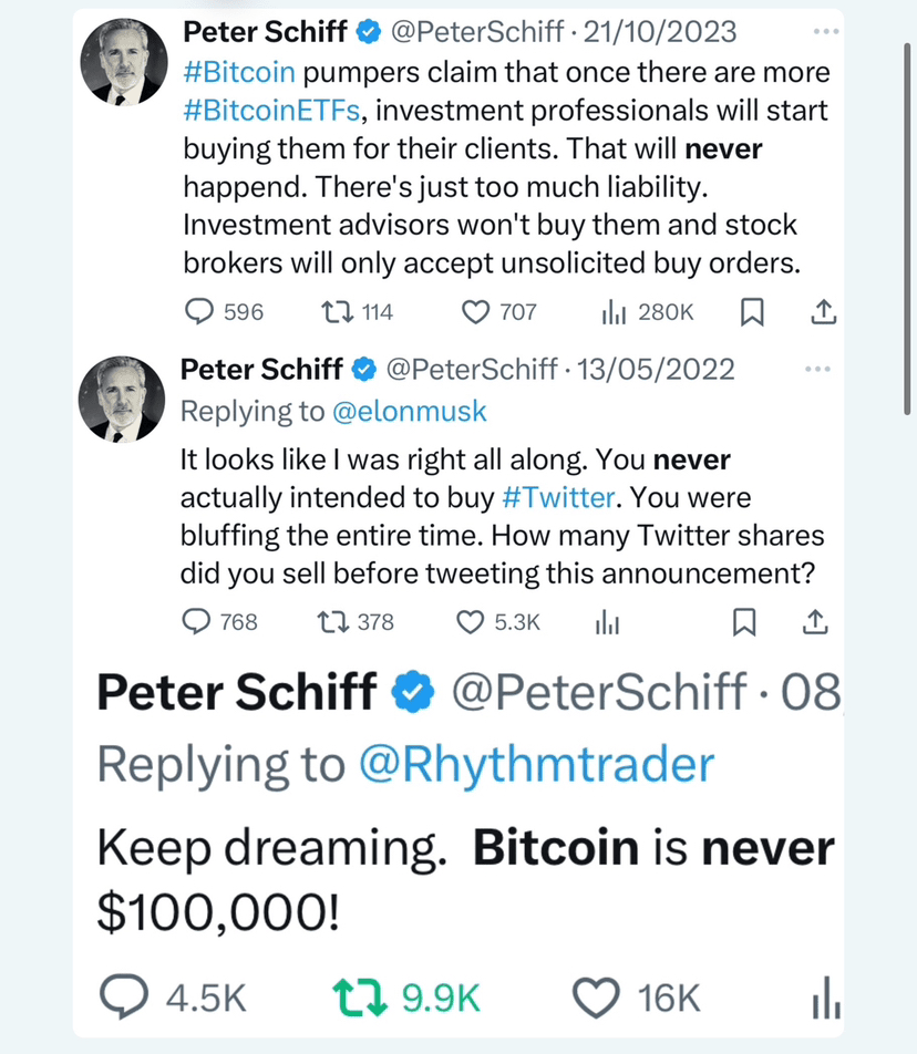 Słynny ekspert finansowy i krytyk kryptowalut Peter Schiff, który zwrócił uwagę społeczności kryptowalutowej stwierdzeniem, że Bitcoin nie ujrzy 100 tysięcy dolarów, stał się celem krytyki, gdy Bitcoin osiągnął historyczny punkt zwrotny. W swoich poprzednich wypowiedziach Schiff stwierdził, że osiągnięcie przez Bitcoin kwoty 100 tys. dolarów jest niemożliwe i stwierdził, że ci, którzy wierzą w ten cel, mogą „nadal marzyć”.