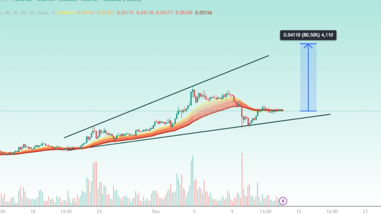 Ten wykres pokazuje parę GALA/USDT w 4-godzinnym interwale czasowym. Rynek formuje wzrostowy klin, co sugeruje potencjalny byczy momentum. Cena konsoliduje się w pobliżu dolnej linii trendu po ostatnim cofnięciu. Wykres podkreśla możliwy wzrost o 80,50%, wskazany niebieską strzałką, z celem w pobliżu 0,09 USD. Wstęga EMA (pokolorowane pasy) zapewnia wsparcie, pokazując siłę byczą, gdy cena pozostaje powyżej niej. Wolumen wzrósł podczas trendu wzrostowego, sygnalizując zainteresowanie zakupami. Silny byczy rajd może wystąpić w kierunku przewidywanego celu, jeśli cena utrzyma się powyżej linii wsparcia i przełamie w górę.