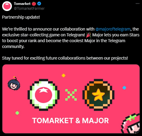 12 września Tomarket ogłosił ekscytującą współpracę z Major Coin, ekskluzywną grą na zbieranie gwiazd na Telegramie. Partnerstwo to jest znaczącym krokiem, ponieważ Major nagradza graczy Gwiazdami, aby zwiększyć ich rangi i stać się najpopularniejszym Majorem w społeczności Telegram.