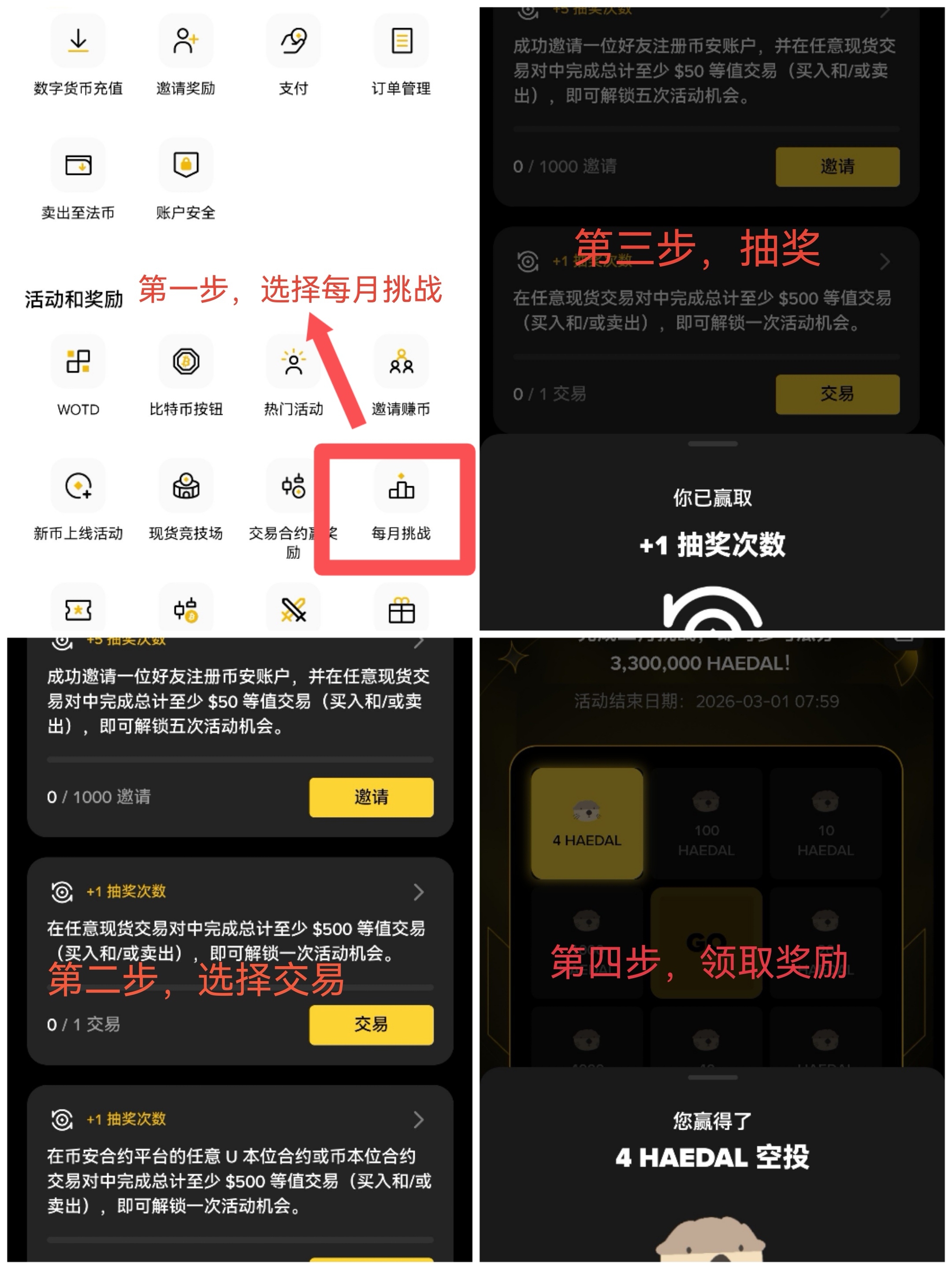 Co miesiąc nowe zadanie z czerwoną kopertą! Wystarczy wykonać odpowiednie zadania, aby zdobyć szanse na loterię, a za każdym razem można wygrać maksymalnie 4000 tokenów haedal, co odpowiada 200U. Widziałem wielu przyjaciół, którzy wylosowali 1000, po prostu „super”!