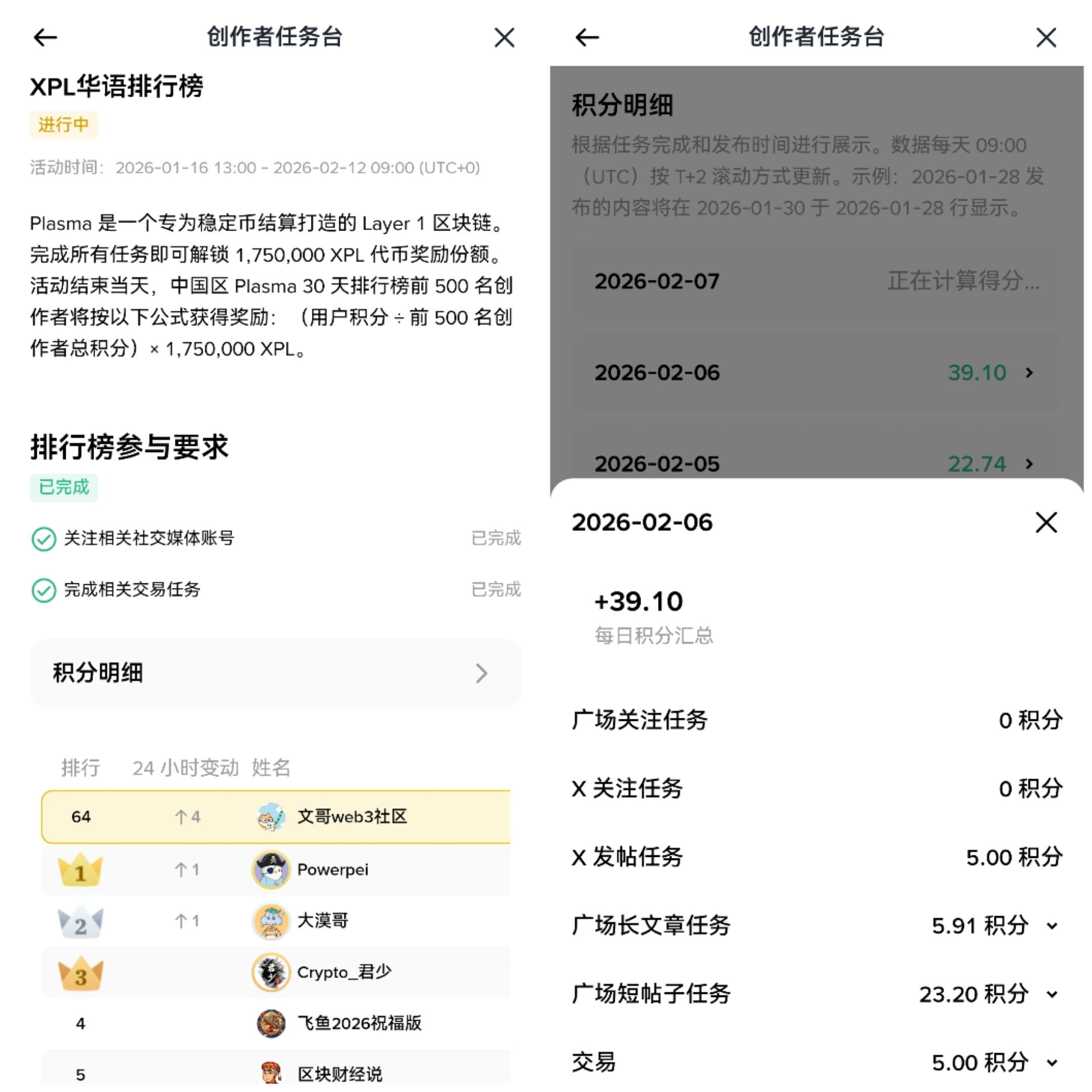 对于@Plasma ,每天发推可以固定拿5分,然后每天可以刷个500u的xpl交易量(现货以及合约买卖都算),交易你可以再拿个5分,刷完了还可以去抽奖,也是一举两得哦。这样,你每天保底可以拿10分,然后就是发文章,每天可发两篇(长短文各一篇),每篇文章上限100分,也就是如果你出个爆款,基本就可以进入前500啦。冲起来吧,加油!