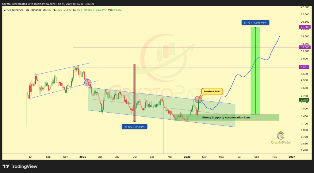 Crypto Patel wyjaśnia, że ZRO spadło o około 84% w ramach wielomiesięcznego opadającego kanału, który rozpoczął się w 2024 roku. Ruch cenowy w tym kanale stworzył przedłużony okres presji, jednak najnowsze świece teraz naciskają bezpośrednio na górny opór.