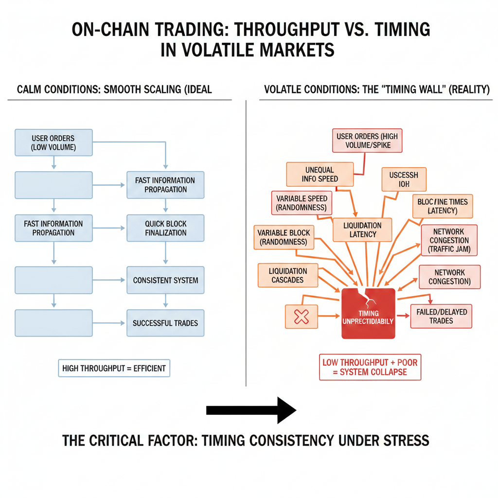 Wtedy zdajesz sobie sprawę z czegoś ważnego: w handlu na łańcuchu problem nie dotyczy tylko przepustowości. Chodzi o timing. To brzydka losowość tego, jak szybko porusza się informacja, jak szybko bloki się finalizują i jak spójny wydaje się system, gdy tysiąc osób próbuje zrobić to samo w tym samym czasie.