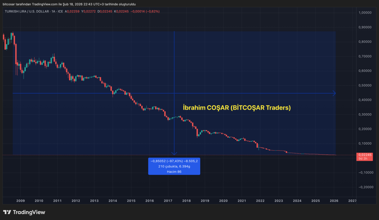 📉 Od szczytu na poziomie 0.87140 USD w 2008 roku, lira straciła około 97,42% swojej wartości w stosunku do dolara.