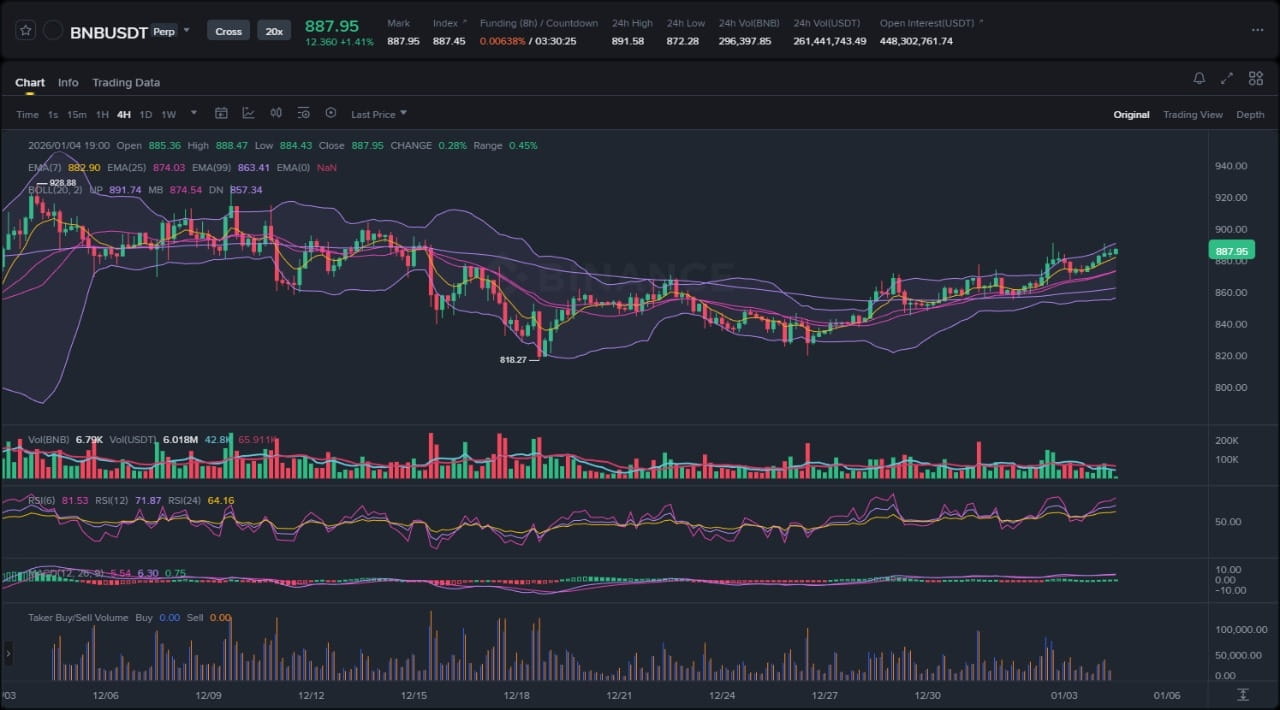 Wykres BNB/USD w czasie 4-godzinnych przedziałów wykazuje wyraźną strukturę trendu wzrostowego, charakteryzującą się wyższymi szczycami i wyższymi dnom od niedawnej lokalnej doliny w połowie grudnia. Cena zakończyła impulsywny wzrost pięciowalutowy od tego poziomu, a następnie krótką fazę konsolidacji tuż poniżej niedawnej lokalnej szczytowej wartości. Obserwowalne elementy obejmują decyzyjny przebój powyżej 50-okresowej średniej wykładniczej, pozycjonowanie w pobliżu górnej pasma Bollingera oraz rozszerzający się histogram MACD potwierdzający siłę trendu. Względna wrażliwość zmienności nieznacznie spadła podczas fazy konsolidacji, co sugeruje akumulację przed potencjalnym rozszerzeniem. Lokalne szczyty wahania w pobliżu poziomu 890 USD stanowią opór i miejsca skupienia płynności, podczas gdy struktura pozostaje niezakłócona bez znaczących niższych dolin. Ogólna tendencja jest wzrostowa, napędzana przez utrzymującą się kanałem wzrostowym oraz zgodnym ułożeniem średnich ruchomych w konfiguracji ułożonej w górę, co wskazuje na kontrolę kupujących bez znaczącego przebicia w dół.