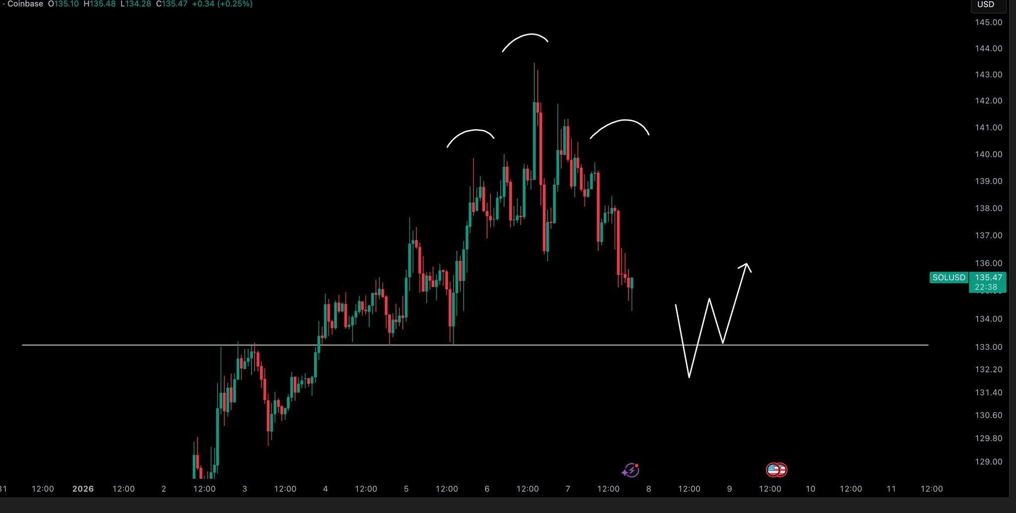 Wykres SOL/USD, który mamy przed oczami, nie kłamie: pływamy w burzliwych wodach. Jeśli uważnie spojrzycie na białe łuki, które narysowałem wyżej, widzicie formację "Ramie- Głowa- Ramie". W języku ulicznym oznacza to, że cena zaczyna się męczyć z wzrostem i chce się odłożyć na chwilę w dół. Cena właśnie odbiła się od poziomu 135,47 USD, a ta pozioma biała linia w pobliżu 133 USD to nasz mur ognia. Jeśli przebijemy go w dół, możemy pójść szukać 116 USD, by odetchnąć. Ale uważajcie na białą "W" po prawej stronie: jeśli uda nam się utrzymać ten poziom wsparcia, aktywujemy podwójne dno i znów wystrzelimy w górę, ku 145 USD lub więcej. 📈