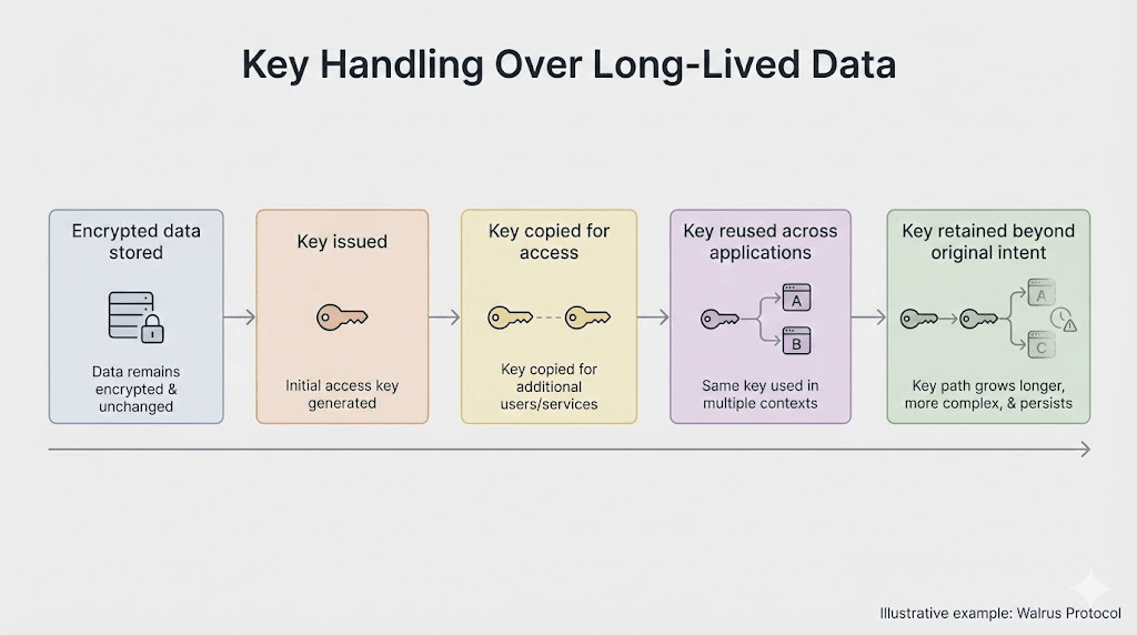 Gdy zaszyfrowane obiekty żyją długo, przemieszczają się między aplikacjami i przetrwają aktualizacje, klucze nie są już konfiguracją i zaczynają zachowywać się jak coś, co nadal jest obsługiwane. Są znowu dotykane. Przemieszczane znowu. Ponownie wykorzystywane. Każdy dotyk wydaje się uzasadniony w izolacji. Żaden z nich nie wydaje się być momentem, w którym prywatność zawiodła.