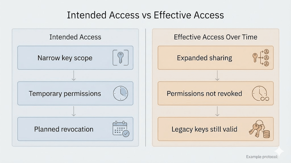 Dryf zaczyna się wcześniej niż wyciek. Zaczyna się, gdy dostęp nieco się rozszerza, ponieważ unieważnienie byłoby irytujące. Gdy tymczasowe udostępnienie staje się stałym uprawnieniem. Gdy przechowywanie niecustodialne jest nadal nienaruszone... ale opieka nad kluczami już cicho osłabła, w trakcie przekazania.