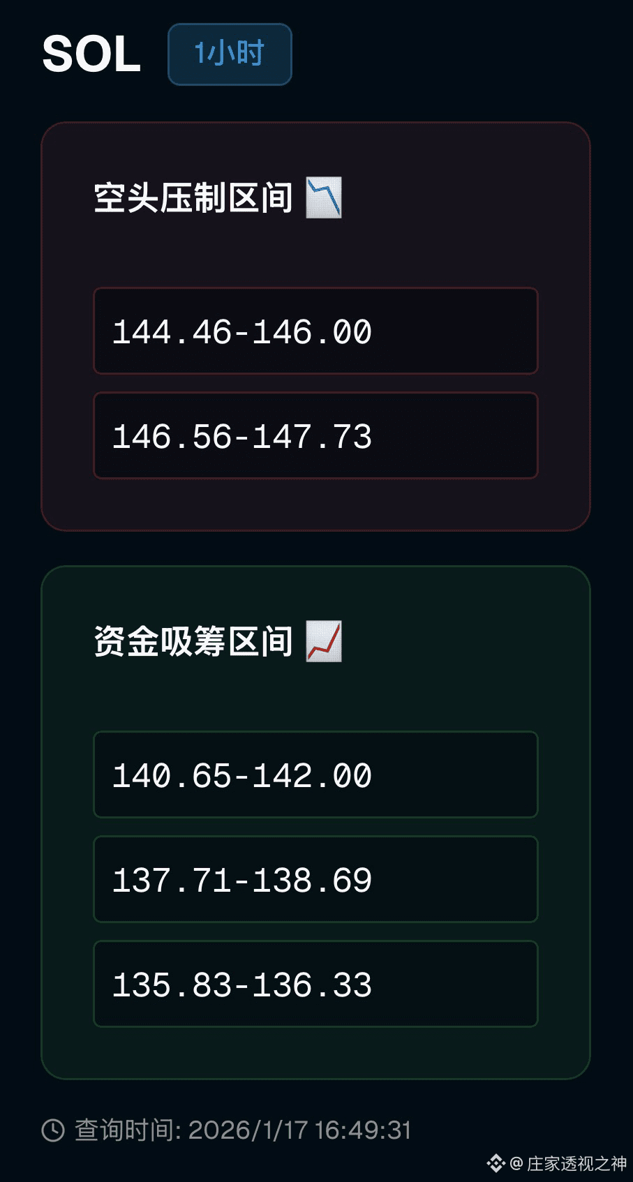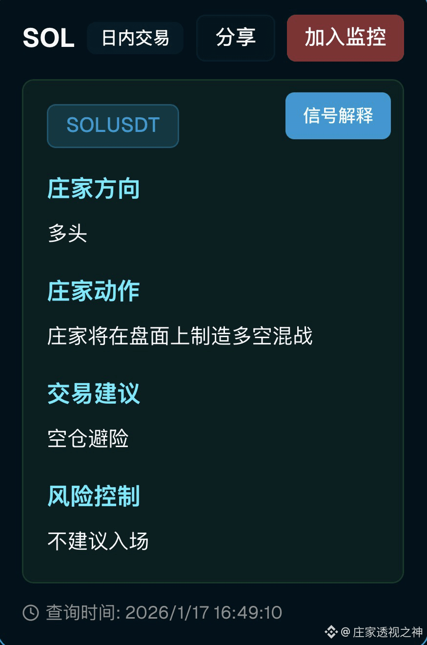 怎么应对最稳:别在144这种夹心位置硬开仓,尤其别追突破;想做多就盯紧140.65-142.00的回踩承接力度,只有出现快速回踩不破、回收速度快、连续站回142上方,才算“回踩确认”,否则就是给主力送筹码;如果真强到能把146.00吃掉并且稳稳站住,那才算短线多头重新掌控节奏,目标才有机会去试探146.56-147.73,但到了这段反而要更谨慎,因为最容易出现“拉高一波让你以为主升开始,然后直接砸下来”的经典诱多;做空这边别抄底别硬顶,真要空也只适合等冲到压力区出现明显乏力再小仓试错,止损就放在压力上沿外面,别幻想一把吃到大瀑布。总结一下:SOL现在是主力偏多但走法偏乱,短线核心就看144.46-146.00能不能变支撑,变不了就是震荡洗人,回踩优先看140.65-142.00的承接,撑住才有二次上攻的戏;今天最怕的就是你在中间追涨杀跌,被主力用节奏反复摩擦,稳一点就等关键区间给答案再动手,仅供参考。