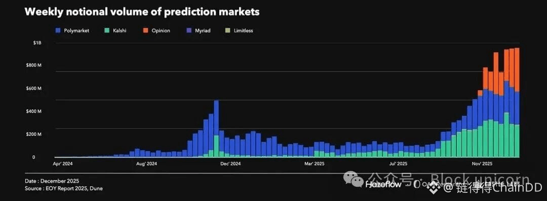 该行业在 2025 年第四季度经历了爆发式增长,各平台月交易量接近 100 亿美元,远超 2024 年的峰值。12 月份,周交易量达到 38 亿美元,较年初增长约 660%。