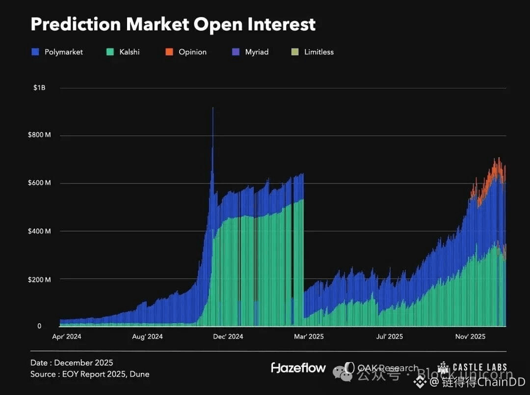 它们的统治地位毋庸置疑:在总持仓量中,Polymarket 和 Kalshi 分别占据 44% 和 47%。然而,名义交易量的分布则较为复杂。到年底,Kalshi 的交易量约占 22%,Polymarket 占 33%,而 Opinion 则占据了近 43% 的交易量。