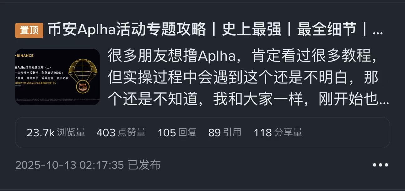 Mój pierwszy twórczy tekst opublikowałem na 🔶 Binance Square, dotyczył podstawowego kursu Alpha, jeśli jesteś zainteresowany, możesz to zobaczyć👉Przewodnik po wydarzeniach Binance Alpha丨Najsilniejsze w historii丨Najpełniejsze szczegóły丨Łatwe do zrozumienia丨Must-read dla nowicjuszy (część 1)——Trzy kroki do zdobycia airdropu nowego tokena, roczna stopa zwrotu do 600%+, ten artykuł miał kilka tysięcy odsłon, co pozwoliło mi zdobyć ponad 300 nowych fanów🙂