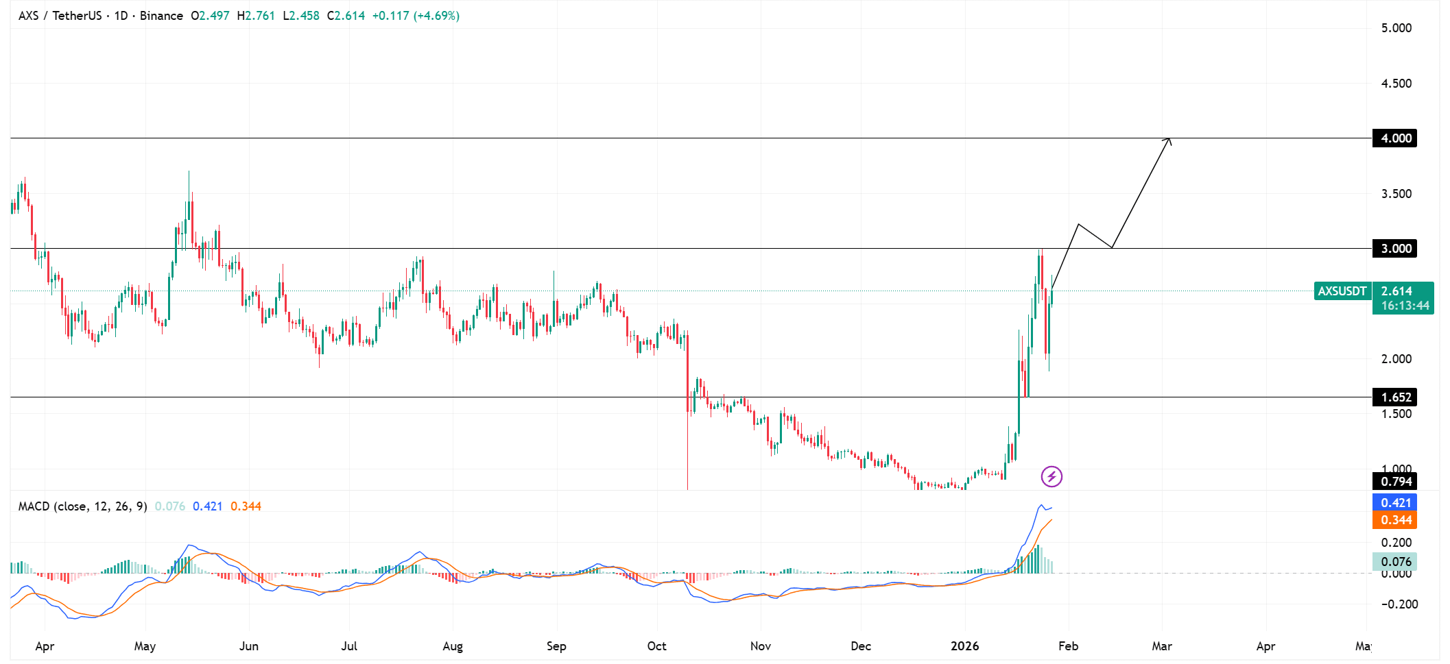 Przełamanie poziomu $3.00 otworzy drzwi do $4.00. Wskaźnik MACD pokazuje, że momentum rośnie, a nie słabnie.