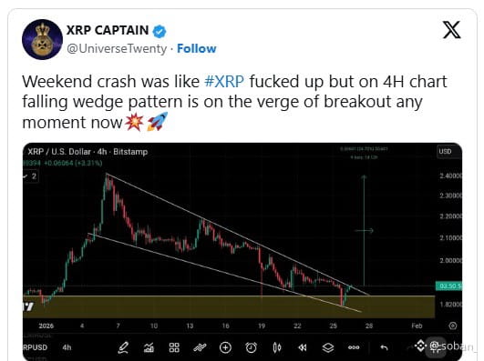 Crypto analyst XRP Captain (@UniverseTwenty) highlighted this setup, noting that XRP is “on the verge of breakout any moment now.”