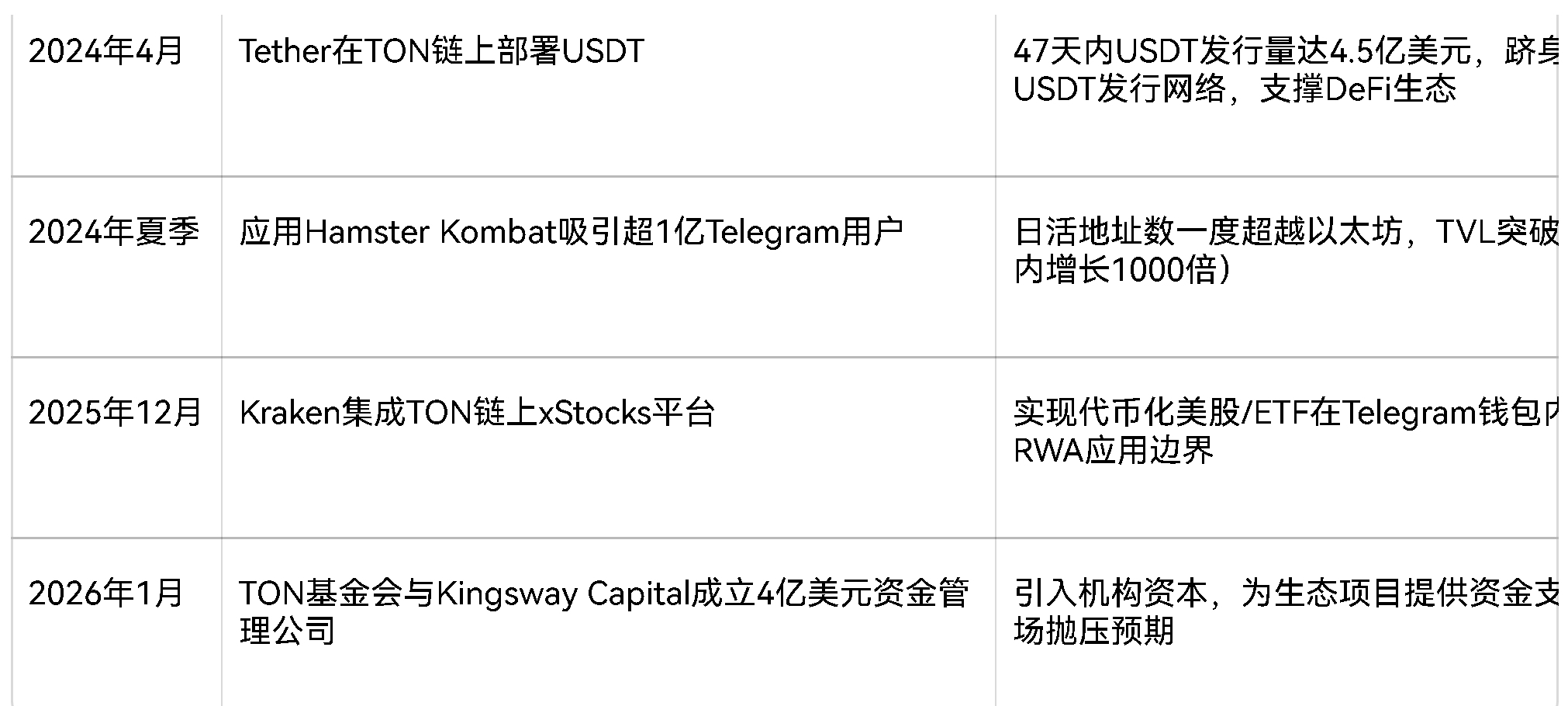 - Połączenie RWA i tradycyjnych finansów: Poprzez platformę xStocks umożliwiającą tokenizację transakcji akcji amerykańskich, a także główne giełdy takie jak Coinbase i Kraken wprowadzają TON, w listopadzie 2025 roku dostosowując się do potrzeb płatniczych 100 milionów użytkowników Telegramu w Stanach Zjednoczonych, rozszerzając tradycyjne scenariusze finansowe.