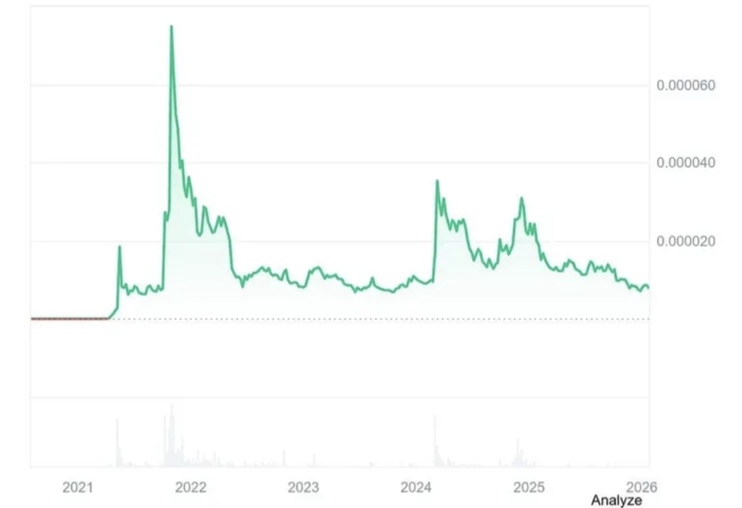 $SHIB (Shiba Inu), wszedł do top 10-20 pod koniec 2021 → Mimo pamiętnych wzrostów, jest bardzo daleko od swojego absolutnego ATH (strata >90-95 % w porównaniu do szczytu 2021, i stagnacja lub względny spadek w fazach niedźwiedzia po 2022).