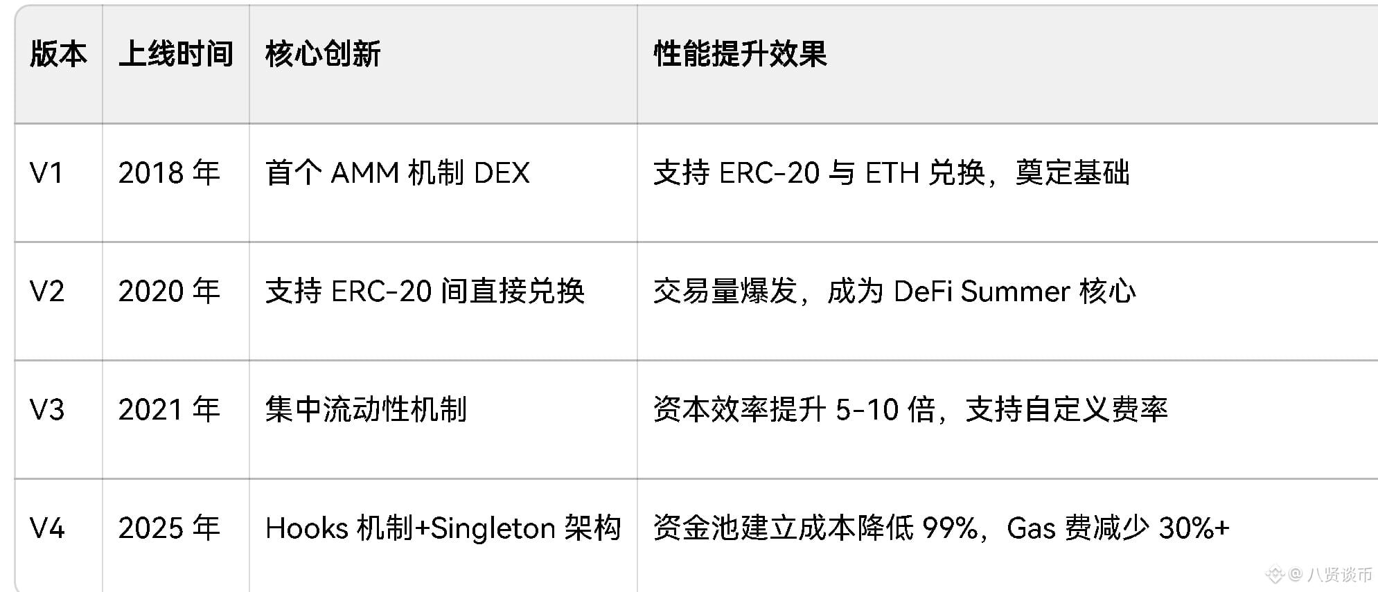 Uniswap 版本迭代核心目标是提升资本效率、降低成本并增强扩展性,各版本关键差异如下: