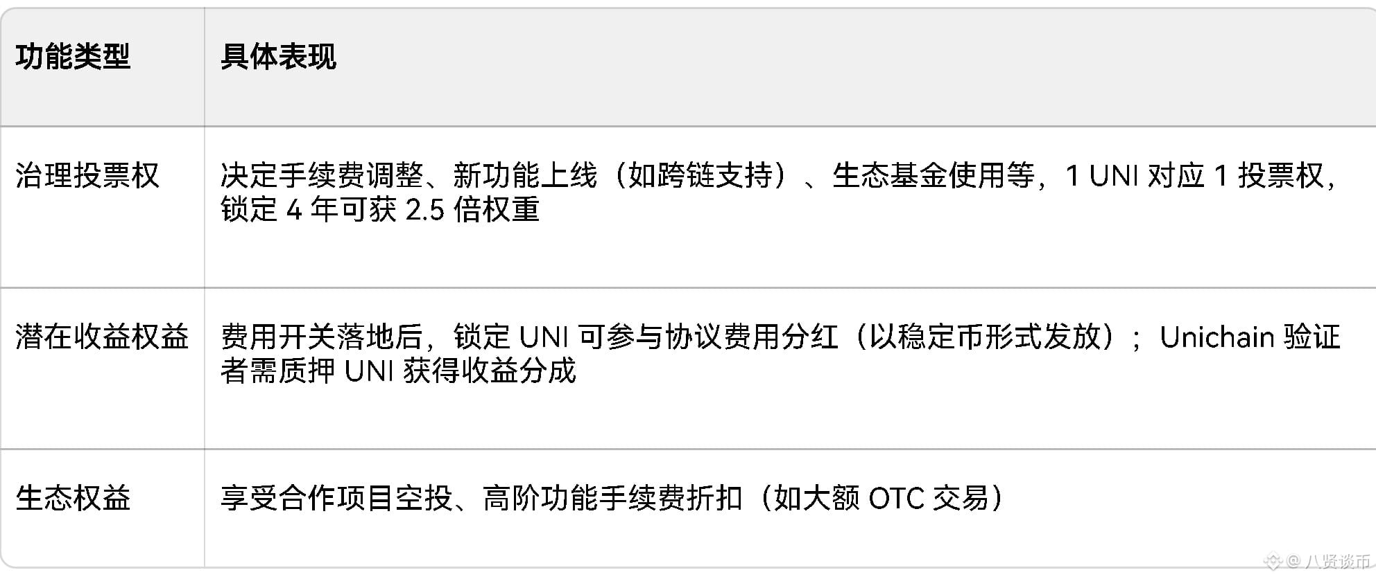 - 收益闭环:65% 净链收入(基础费用+优先费用+MEV)按 UNI 质押权重分配给验证者,为 UNI 增加“质押收益”场景。