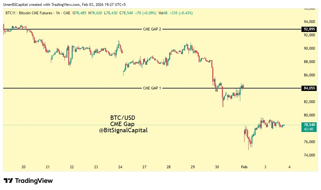 Na wykresie futures BTC CME pozostają dwie główne luki: 🔹 Luka CME 1: $84K–$85K
