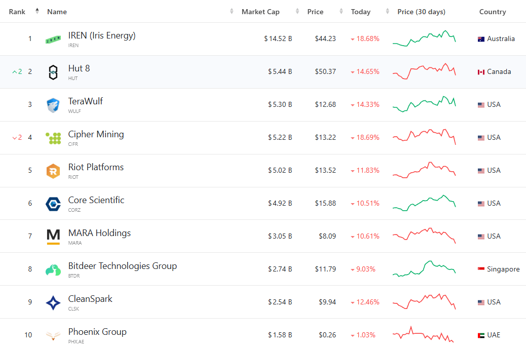 Akcje górnicze zostały najmocniej dotknięte. Marathon Digital Holdings handlował blisko $8.09, podczas gdy Riot Platforms oscylował wokół $13.52, CleanSpark spadł do $9.94, a inni odnotowali spadki przekraczające 10% w dzisiejszej sesji. Tylko Phoenix Group w Zjednoczonych Emiratach Arabskich ma spadek o 1%.