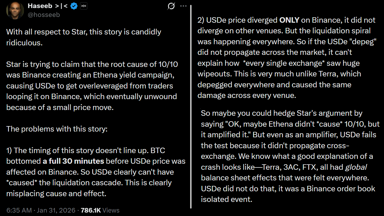 Według Haseeba Qureshiego, zarządzającego partnera w Dragonfly, ogromne likwidacje na Binance „nie mogły zostać zrealizowane, ale silniki likwidacyjne działają mimo wszystko. Spowodowało to, że makerzy rynku zostali zniszczeni i nie byli w stanie podnieść kawałków.” Qureshi dodał, że krach w październiku 2025 roku nie „złamał na stałe rynku”, ale zauważył, że makerzy rynku „będą potrzebować czasu na regenerację.”