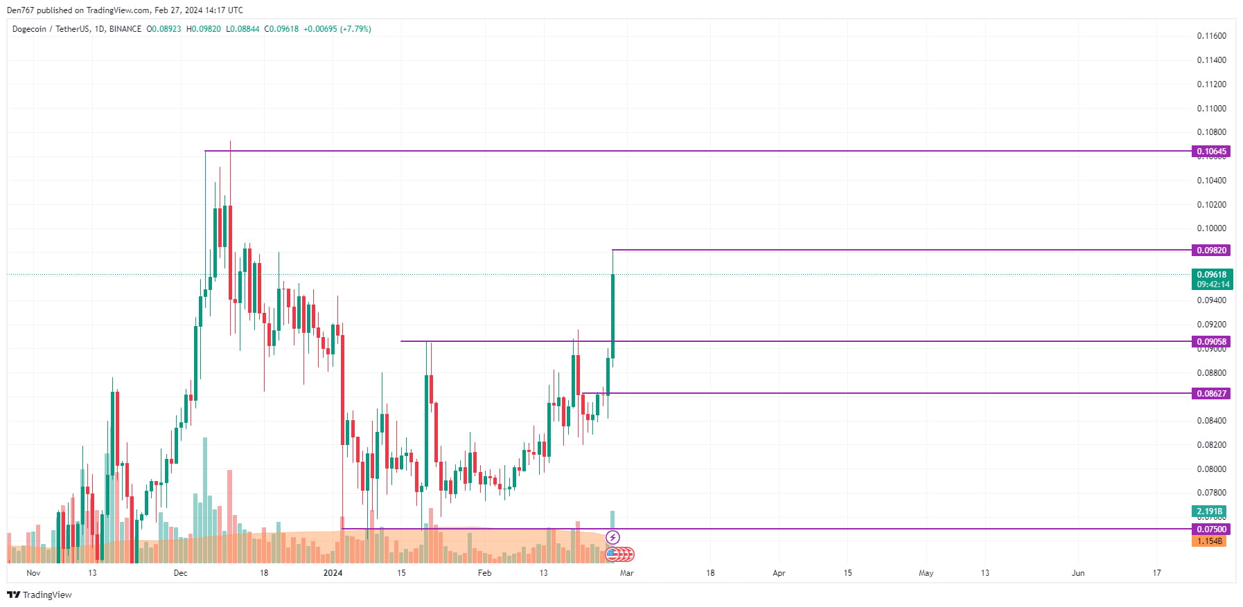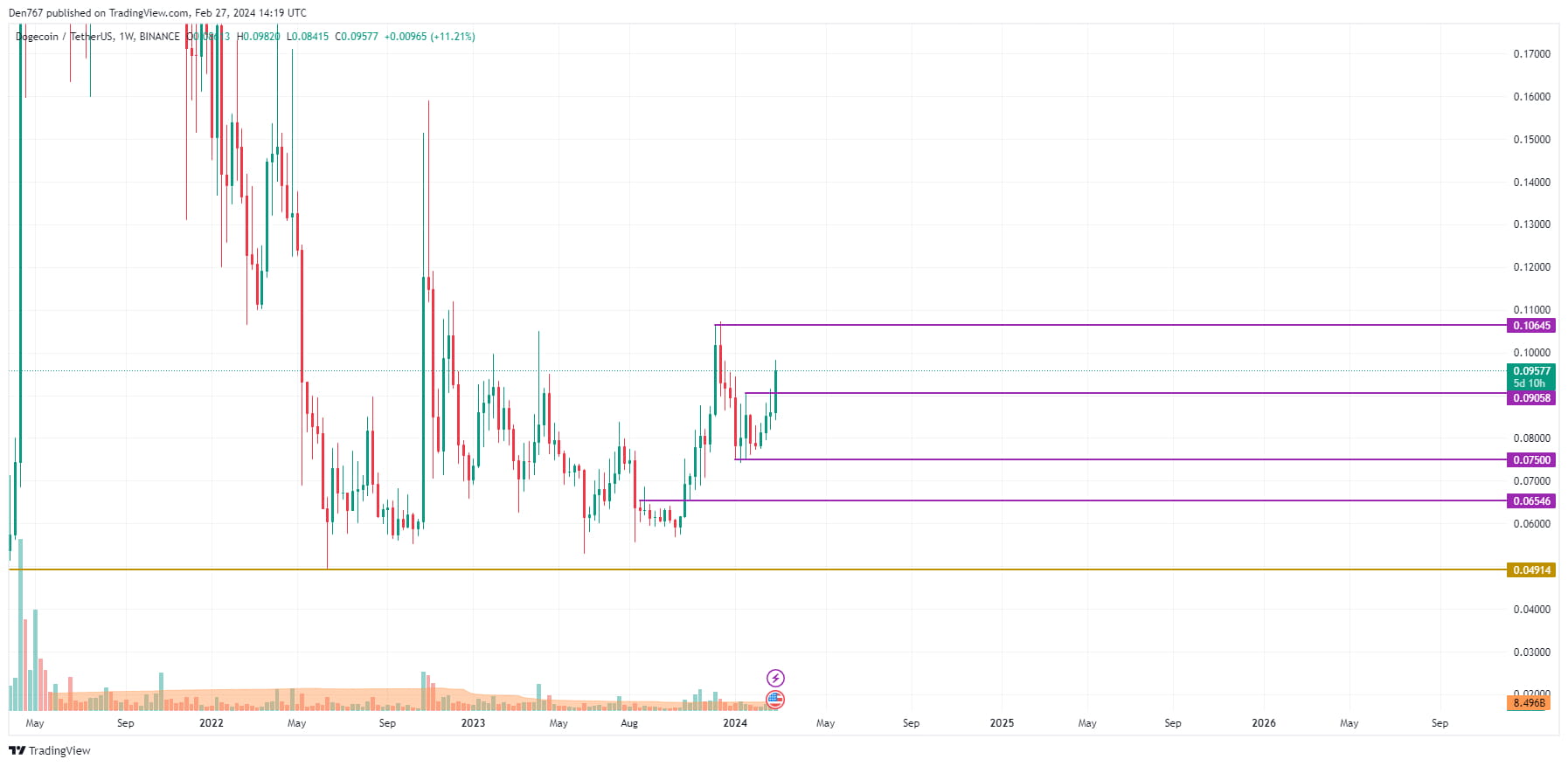 W chwili pisania tego tekstu Dogecoin (DOGE) jest notowany po cenie 0,099 USD.