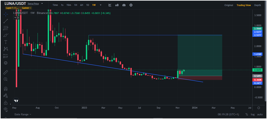 Jak wynika z wykresu tygodniowego pokazanego powyżej, w pierwszym tygodniu listopada LUNA przebiła pewną spadkową linię trendu.