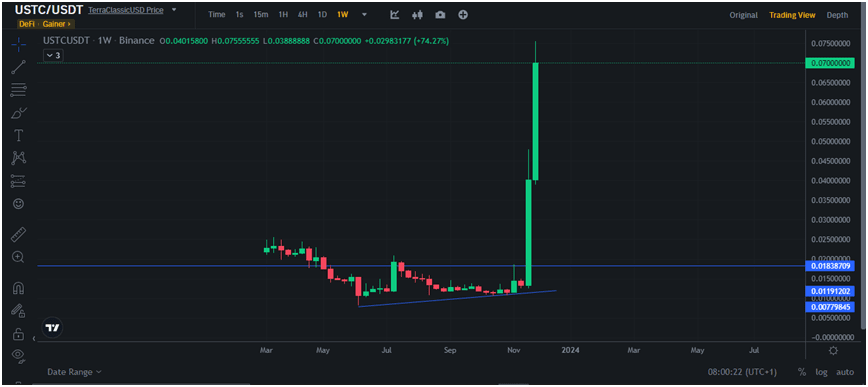 Powyżej pokazano tygodniowy wykres USTC. Kryptowaluta była bardzo zwyżkowa przez ostatnie dwa kolejne tygodnie i zyskała w zeszłym tygodniu ponad 20%, zanim w tym tygodniu osiągnęła 100%.