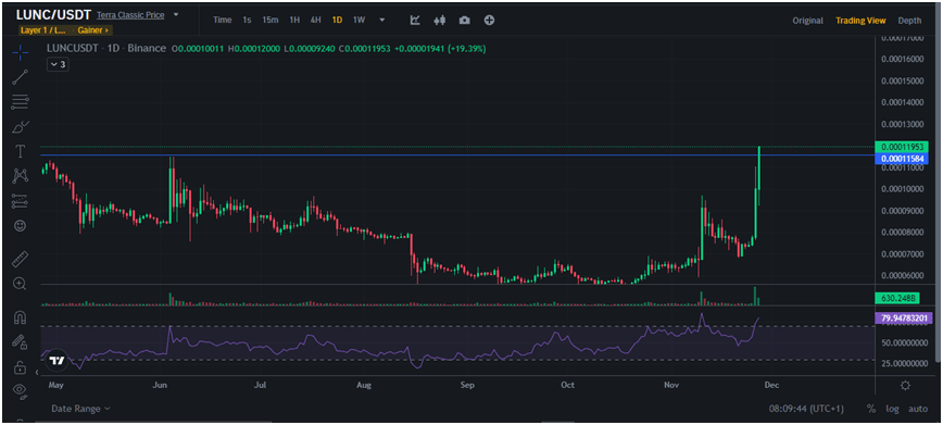 Skoro już mowa o monetach ekosystemu Terra, to Terra Classic, czyli LUNC, również cieszyła się dużym zwyżką w ciągu ostatniego dnia. Kryptowaluta zyskała w ciągu ostatniego dnia aż 45% i obecnie zajmuje drugie miejsce na Binance.
