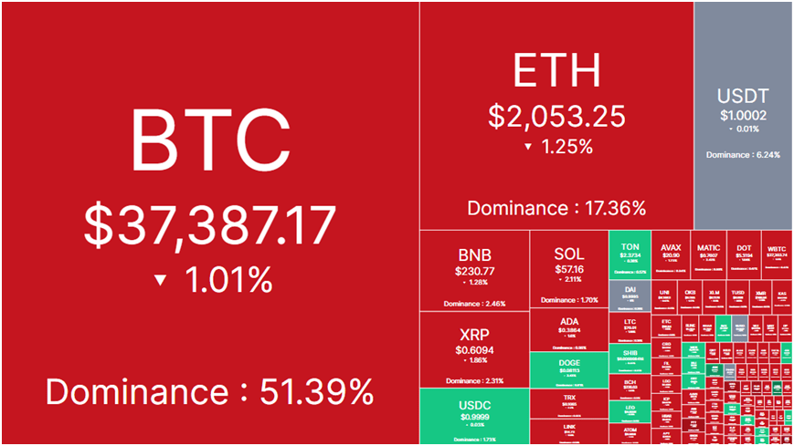 Wskaźnik ten wynosi obecnie 1,42 biliona dolarów w porównaniu z wczorajszym 1,44. Rynek kryptowalut charakteryzuje się „znaczną” ilością czerwieni i obecnie wygląda tak: